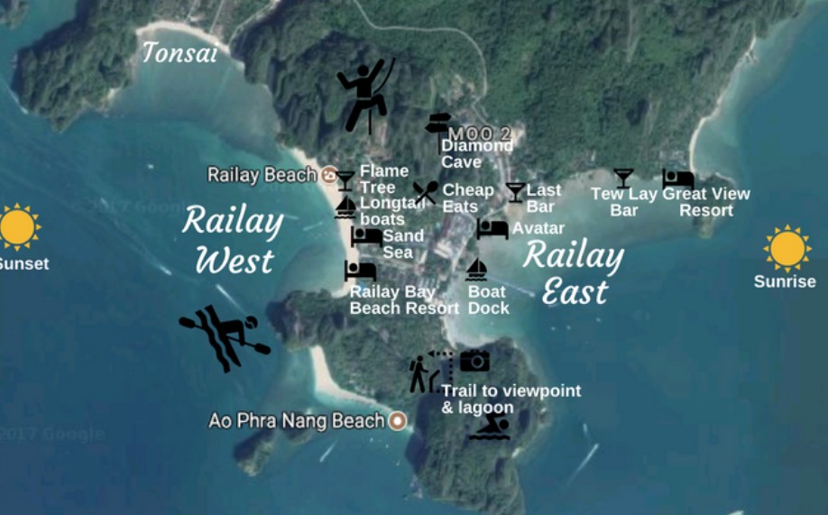 Railay (parfois écrit Rai Leh) se situe dans la province de Krabi, dans le sud de la Thaïlande. Techniquement, ce coin de Krabi est relié au continent, mais les falaises imposantes empêchent toute route de passer. Cela signifie qu’il n’y a pas de voitures à Railay, seulement des chemins piétons.
