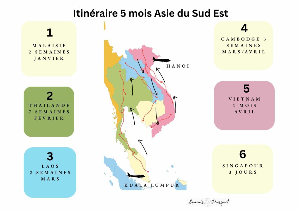 Tu rêves de créer un itinéraire de plusieurs mois en sac à dos en Asie du Sud-Est, mais tu ne sais pas par où commencer ? Dans cet article, je te partage à quoi ressemblait notre itinéraire de voyage de 5 mois à travers l’Asie du Sud-Est, ainsi que mes endroits coups de cœur. L’objectif : t’aider à t’inspirer et à profiter pleinement de cette aventure unique.